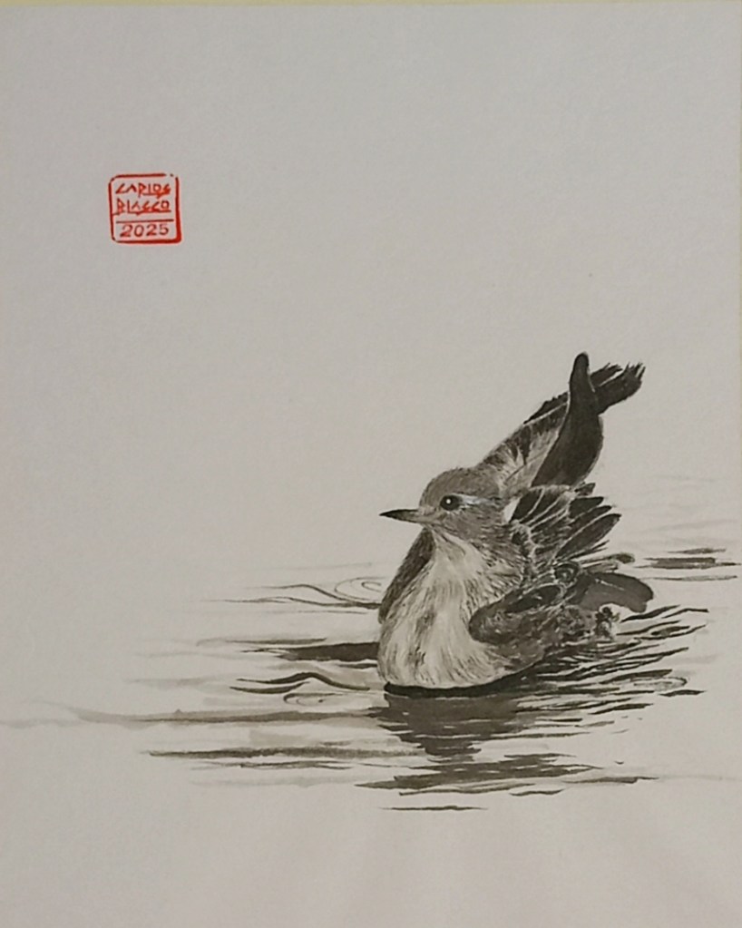 60-Pájaro en una rama- Tinta china sobre papel japonés- 27×21 cms.